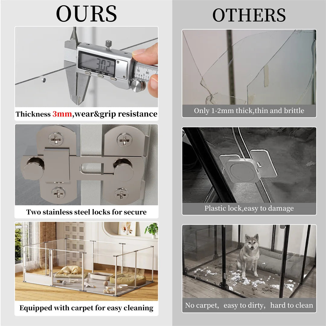 【Clear Acrylic Fence Design】Crystal-clear acrylic dog fence playpen enables you can interact with your pets closely, 360°high transparency and wide vision, it’ll relieve your pets from anxiety, they also make sure you are by their side, equipped with a door for dog mom/ pets to come and go easily, so this is a unique gift for your loved friends, get this versatile fence in the room, instantly elevating your home spaces